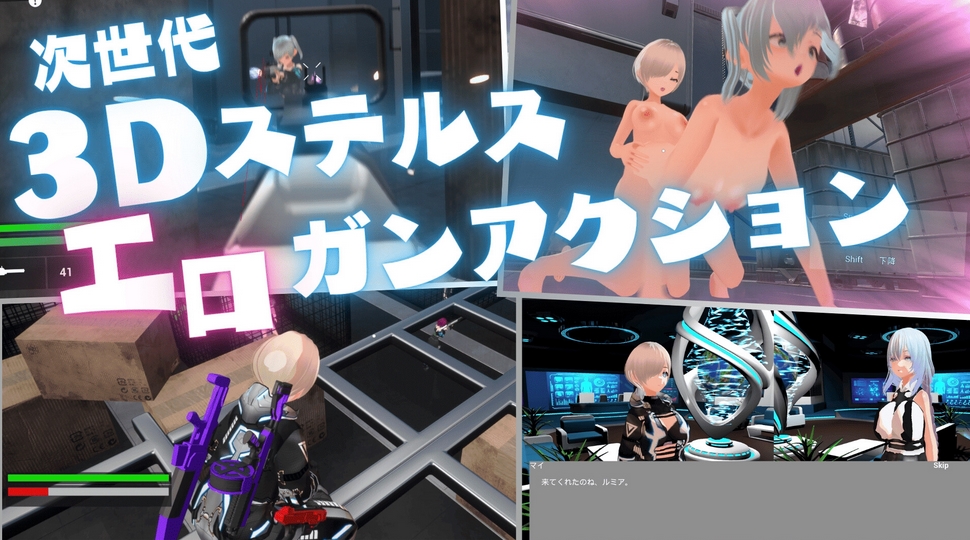 ●コメント:同人ソフト、体験版ではプロローグをプレイできます。ふたなりエージェントの主人公が、敵の女の子たちを銃で倒したり拘束してHで失神させたりしながら進めていく3Dステルスガンアクションゲームかな。